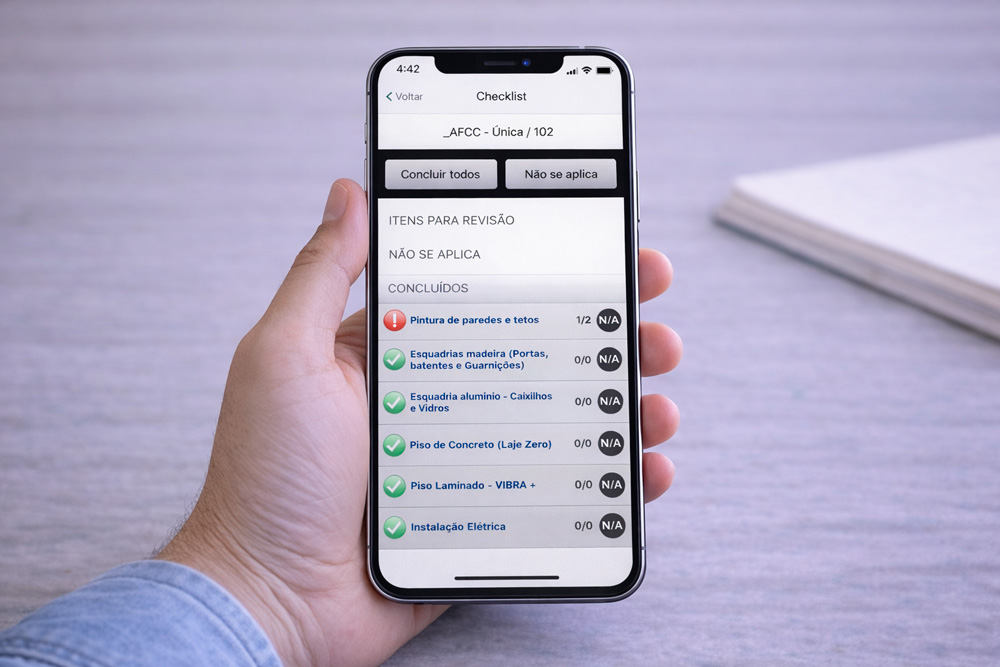 Espelhos de vistoria e checklists configurados conforme o padrão da sua construtora. Fotos georreferenciadas, evidências organizadas automaticamente e zero papel.