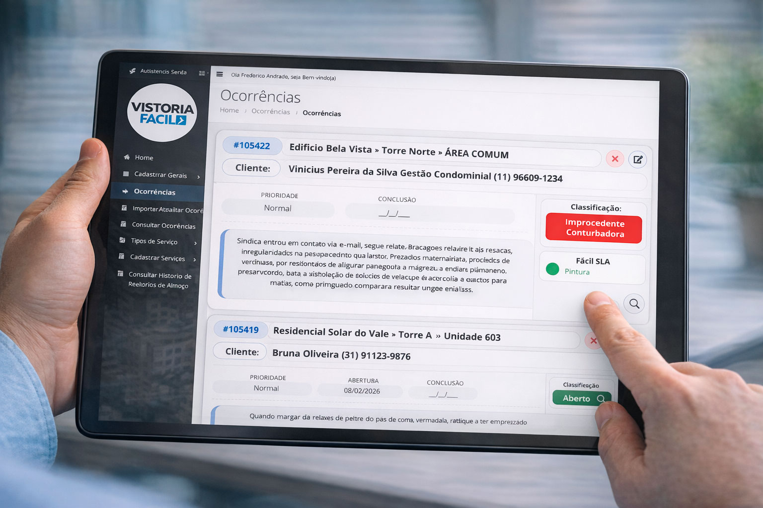 No Vistoria.Fácil você centraliza chamados, controla SLA, registra evidências e acompanha indicadores em tempo real.