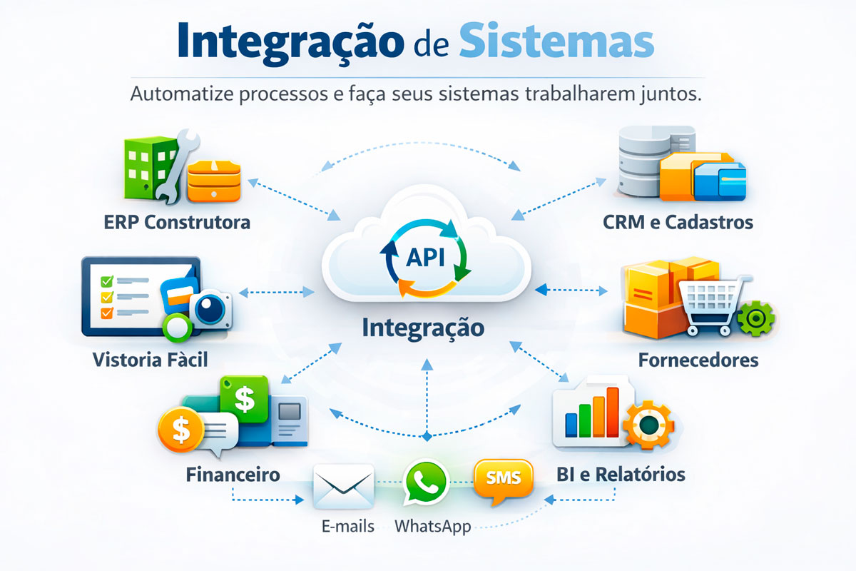 As integrações do Vistoria Fácil seguem um escopo funcional padrão, garantindo consistência de dados entre os sistemas envolvidos.
