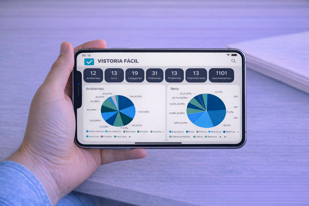 Veja como o Vistoria Fácil digitaliza a operação no celular ou tablet, acabando com planilhas, retrabalho e papel, e trazendo controle real para a gestão da obra.