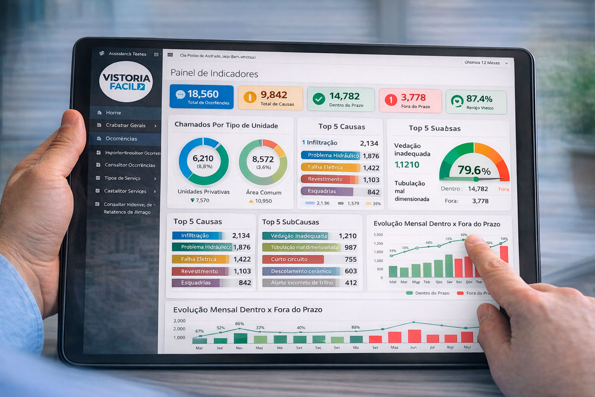 No Vistoria.Fácil você centraliza chamados, controla SLA, registra evidências e acompanha indicadores em tempo real.